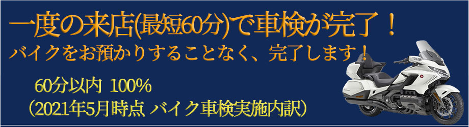 ホリデー車検八王子高倉店では、長年積み重ねてきた経験やノウハウによって、以前のようにバイクをお預かりすることなく、約60分で完了できるようになりました。